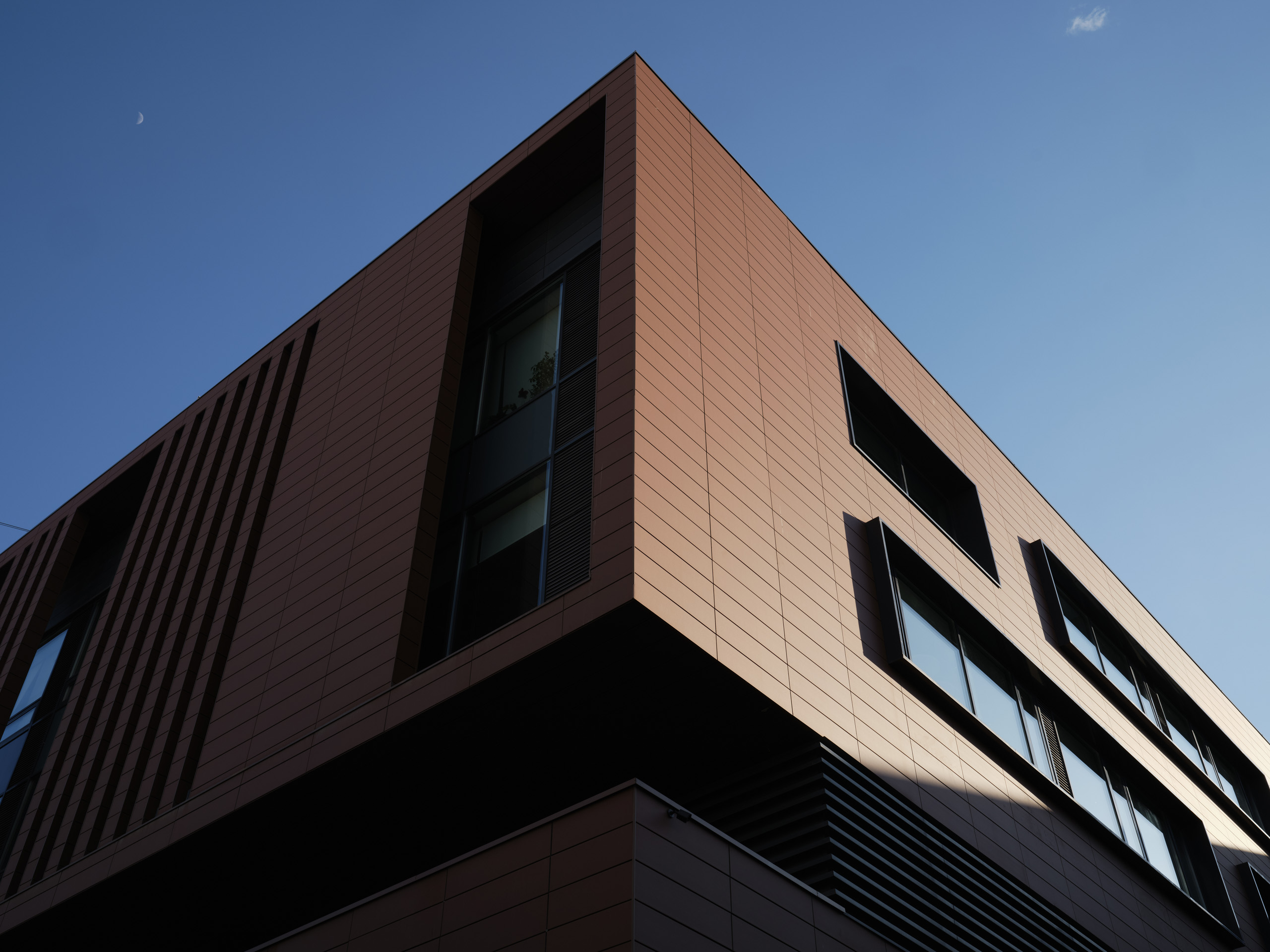 Глубокий кирпичный цвет особняка стал основным для базы нового здания. Исторический масштаб улицы удалось отразить в двухэтажных портиках, оторванных от земли и будто взмывающих вверх. А игра света и тени проявляет всю глубину объема. Здание не выглядит четырехэтажным: за счет вертикальных струн и портиков, его масштаб сдвоен и визуально имеет всего два этажа.